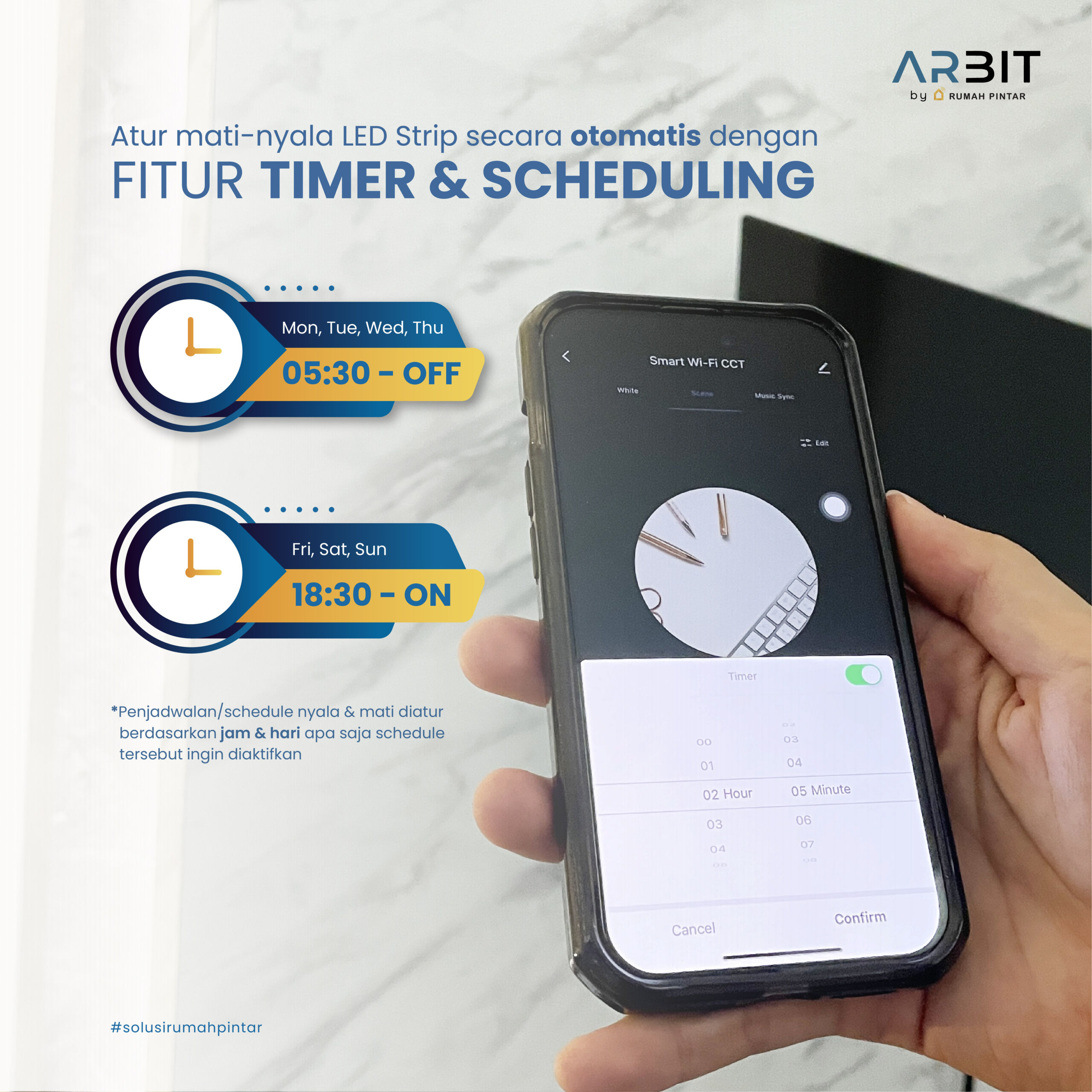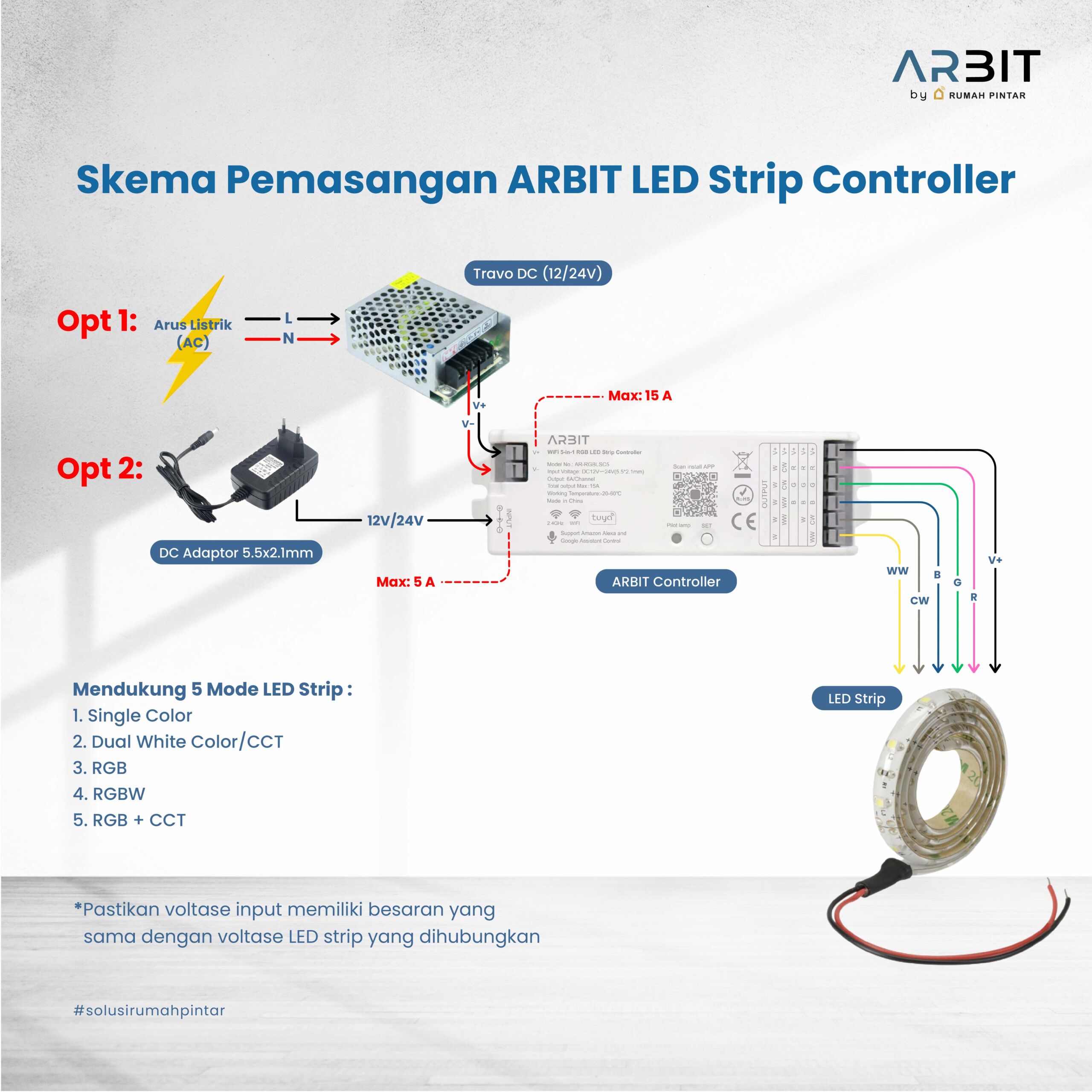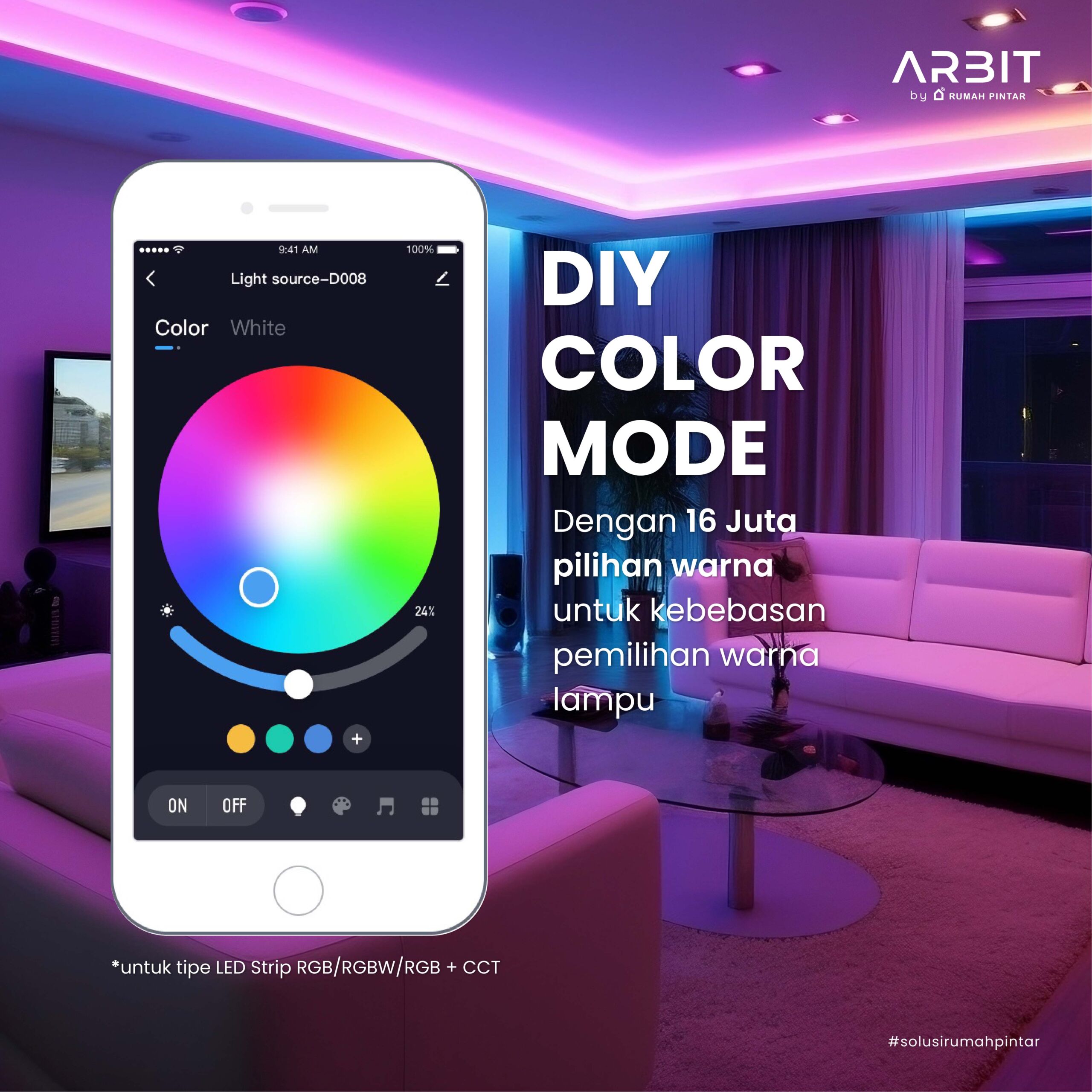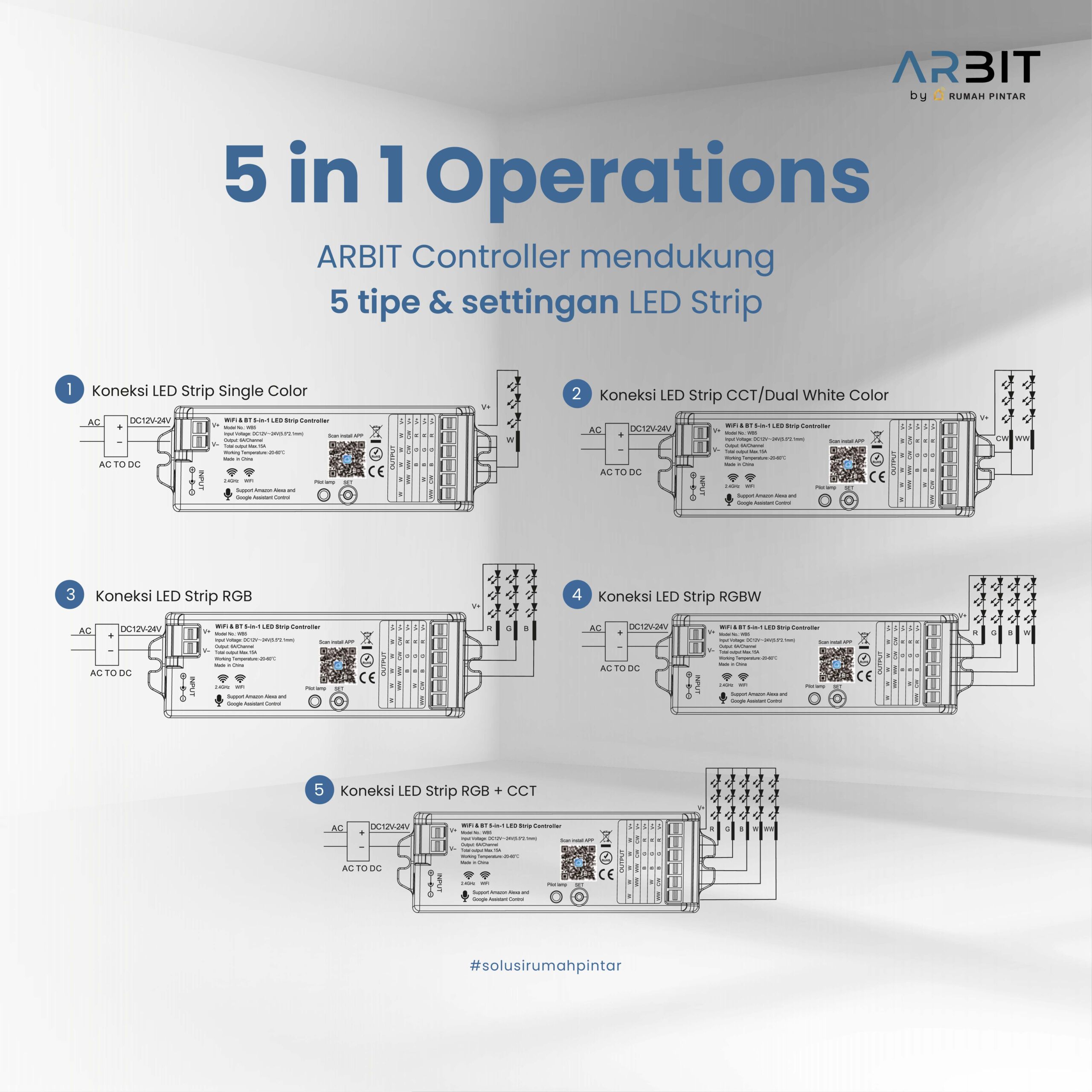 ARBIT WiFi 5 in 1 RGB LED Strip Controller adalah kontroler pintar tambahan untuk LED strip konvensional. Dengan perangkat ini, LED strip biasa bisa di-upgrade menjadi smart LED Strip yang dapat dikontrol lewat aplikasi, perintah suara, timer, dan automasi.