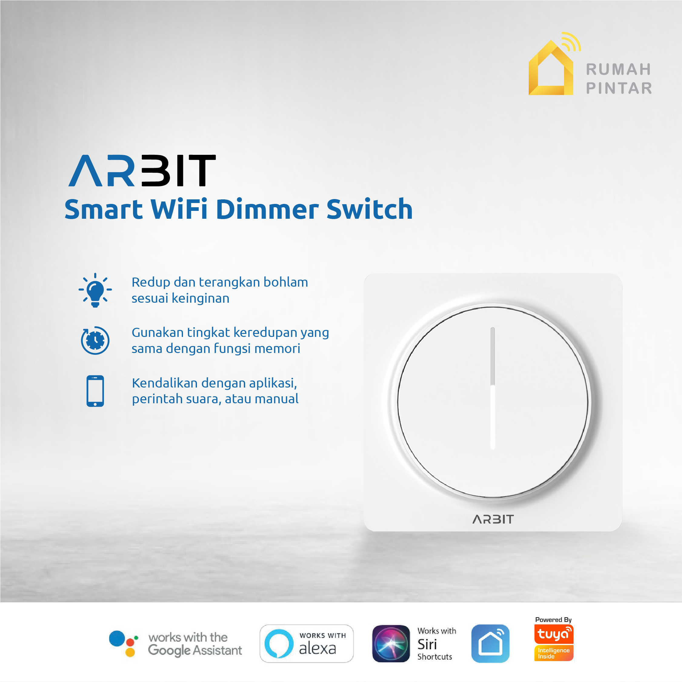 ARBIT WiFi Dimmer Switch kompatibel dengan Google Home dan Amazon Alexa melalui aplikasi Smart Life/Tuya yang tersedia di App Store dan Play Store.