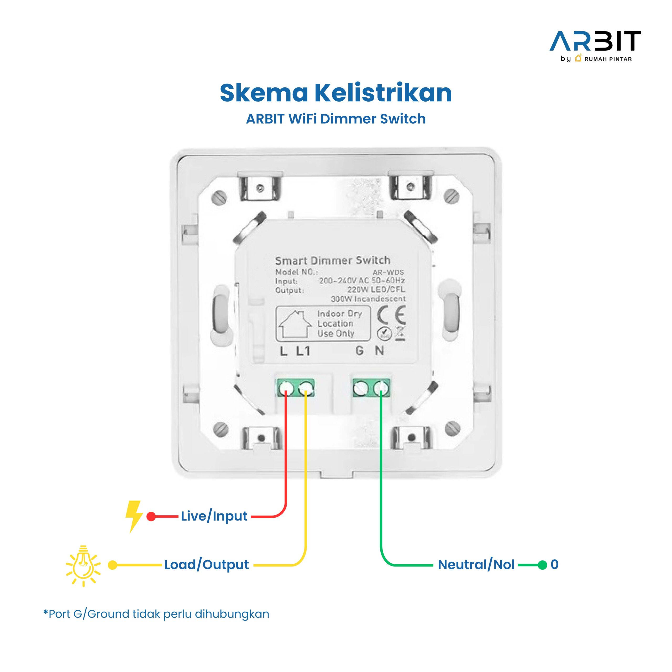 - Tidak dapat digunakan untuk lampu non-dimmable. Produk hanya mendukung LED/CFL 150W yang dapat diredupkan, dan pijar maks 300W.