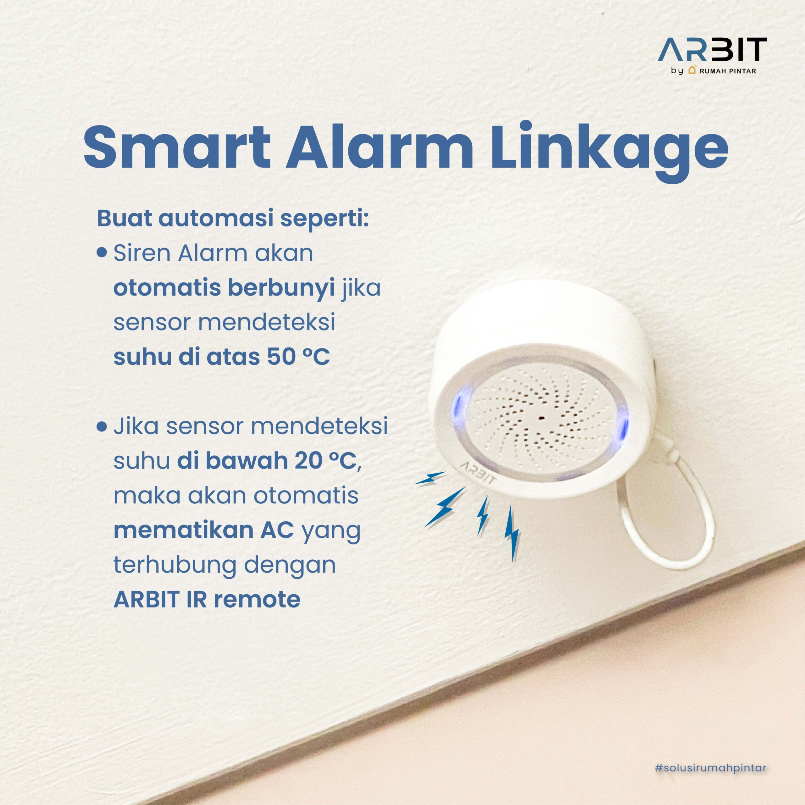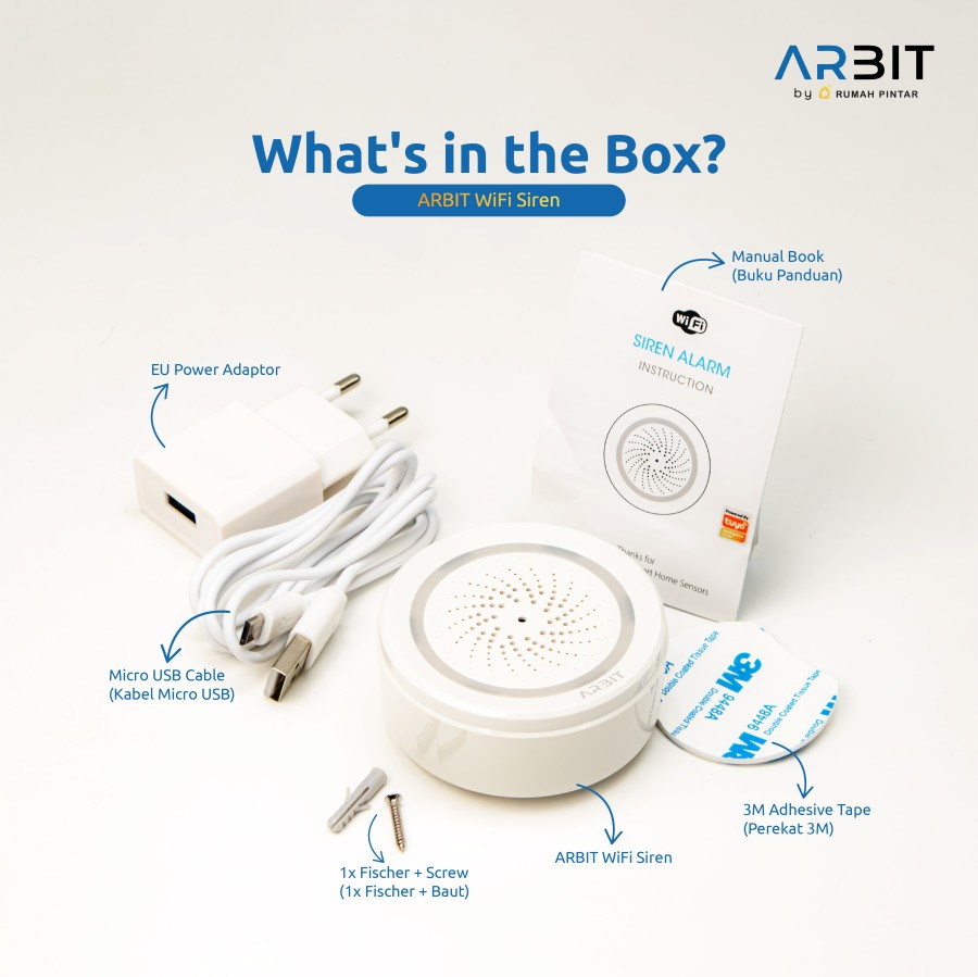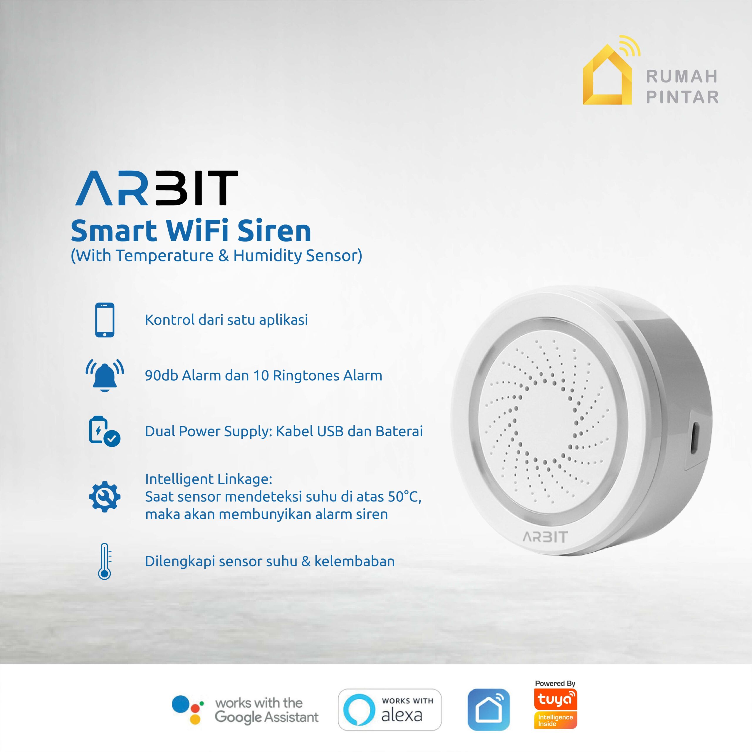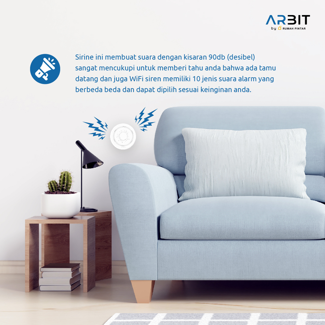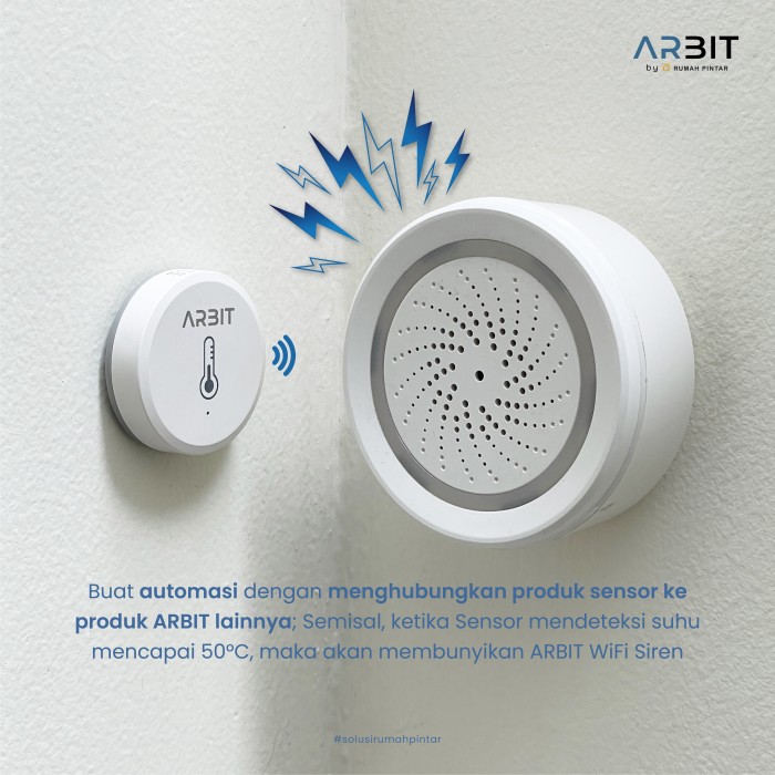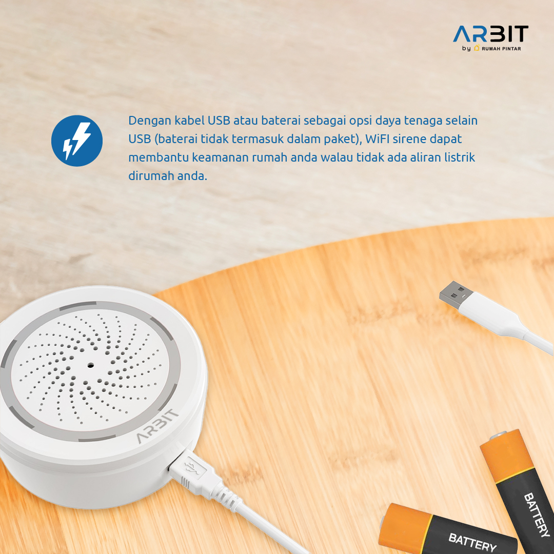 ARBIT WiFi Siren with Temperature & Humidity Sensor adalah alarm pintar multifungsi untuk sistem keamanan rumah. Dengan koneksi ke aplikasi Smart Life/Tuya, pengguna dapat mengontrol siren, mengatur jadwal, serta mengintegrasikannya dengan perangkat smart home lainnya.